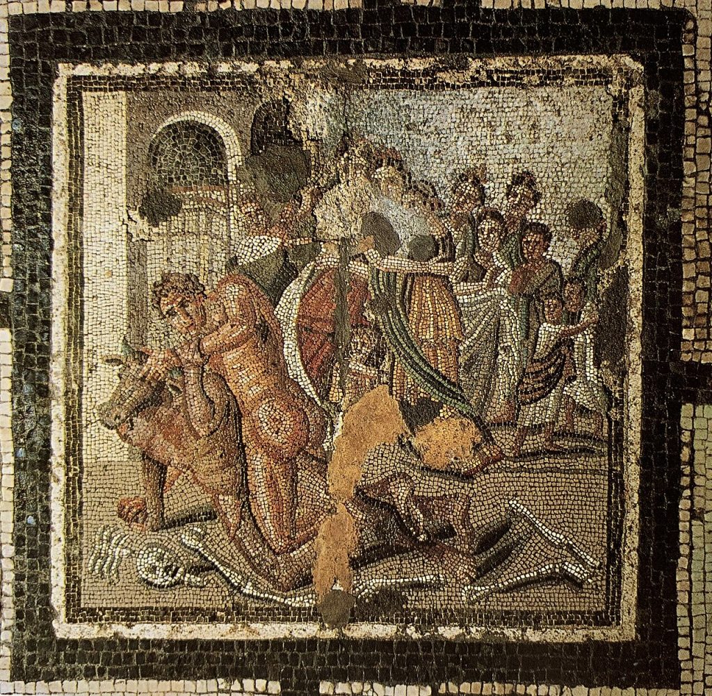 Im eigentlichen Mythos fragt Minos, Sohn von Zeus und Europa und König von Kreta, den Meeresgott Poseidon um ein Zeichen seiner Legitimität. Dieser Antwortet mit einem Geschenk, einem weißen Stier, mit der Bedingung, dass Minos diesen opfert. Der König bricht sein Versprechen und behält den Stier jedoch. Als Strafe verflucht Poseidon Minos Frau Pasiphae, die sich dadurch zum Stier hingezogen fühlt und schließlich ein Kind von dem Stier empfängt, der Minotauros, halb Mensch, halb Stier.